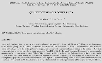 Biljecki F, Tauscher H (2019): Quality of BIM-GIS conversion. ISPRS Ann. Photogramm. Remote Sens. Spatial Inf. Sci. IV-4/W8:35–42. 10.5194/isprs-annals-IV-4-W8-35-2019 PDF