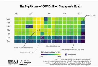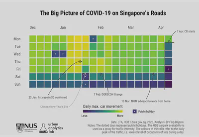 Regarding public transport, LTA provides the Origin-Destination data at the LTA DataMall for both bus and MRT, but it is rather on a monthly basis, without a breakdown by day. It will undoubtedly be useful to check it out once data for March and April are revealed, to get some general trends at least.