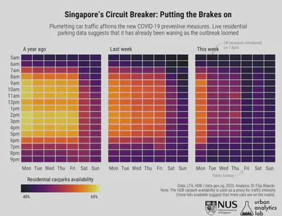The first plot indicates the intensity of car traffic in Singapore in detail (by day and hour) over three periods: the first week of the circuit breaker, last week, and the same period the previous year. The data is derived from HDB carpark availability as a proxy for traffic (more about the data and rationale for this approach is given later). While it is interesting per se to see daily and hourly patterns during the ordinary times, it indicates a considerable drop during the first week of the CB measures. Unsurprisingly, the traffic plunged on the first day of the circuit breaker (Tuesday 7 Apr), and it is at the levels below a typical Sunday when the traffic is usually at its lowest point. Friday was the first public holiday during the circuit breaker, rendering a very notable trace.