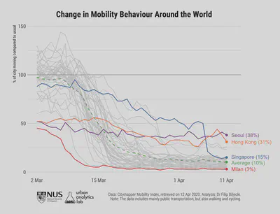 Singapore experienced the sharpest drop among all 41 cities. This may be good news as it indicates that people are taking the measures seriously, drastically changing their behaviour overnight.