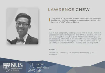 Year 4 NUS Geography undergraduate with a double minor in Geospatial Information Systems (GIS) & Urban Studies, with skill sets in Geospatial Analytics, Data Analysis and Cartography. I am especially interested in the area of Geospatial Analysis and Geospatial Database Management with the intention of value-adding in the area of Urban Planning and Development.