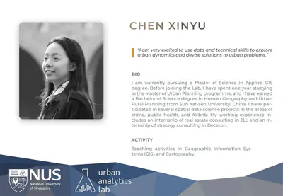 I am currently pursuing a Master of Science in Applied GIS degree. Before joining the Lab, I have spent one year studying in the Master of Urban Planning programme, and I have earned a Bachelor of Science degree in Human Geography and Urban Rural Planning from Sun Yat-sen University, China. I have participated in several spatial data science projects in the areas of crime, public health, and Airbnb. My working experience includes an internship of real estate consulting in JLL and an internship of strategy consulting in Detecon.