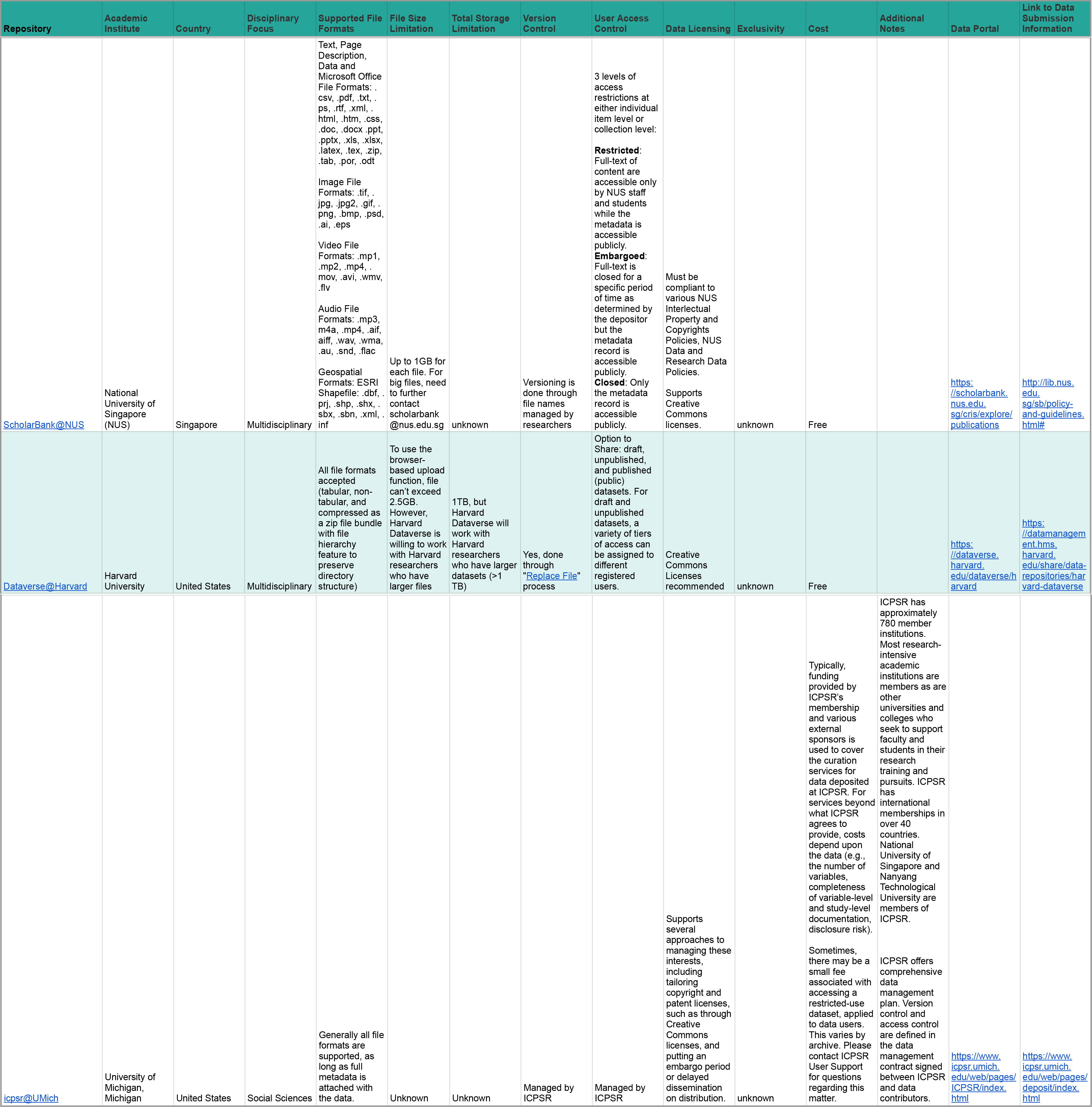 Here we compare ScholarBank@NUS, Dataverse@Harvard and ICPSR@UMich.