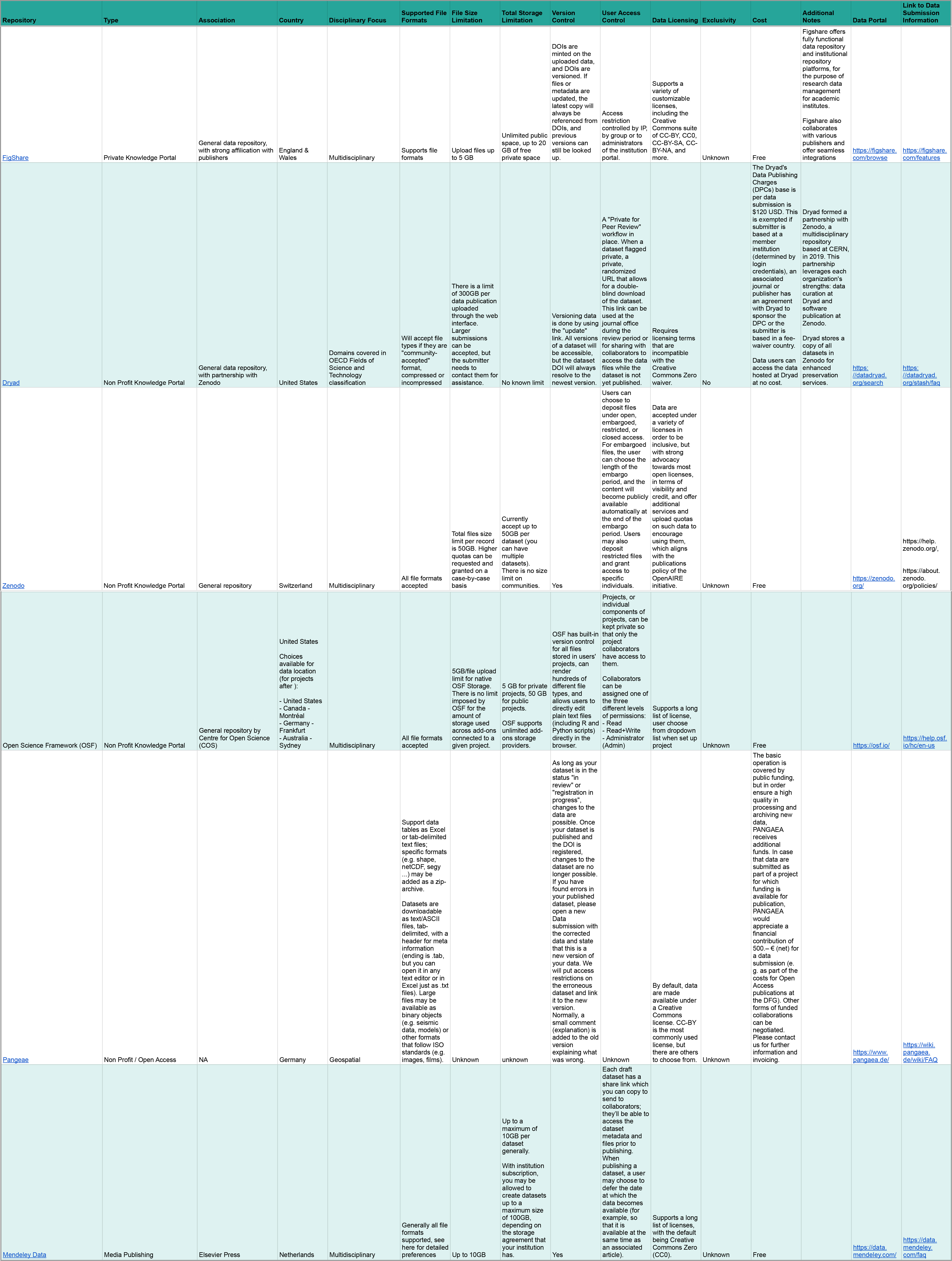 Although this list is not complete with all the research data repositories available, we hope this provides enough viable options for our future research and those who are looking for open data repository solutions. We also welcome other suggestions that we may have overlooked.