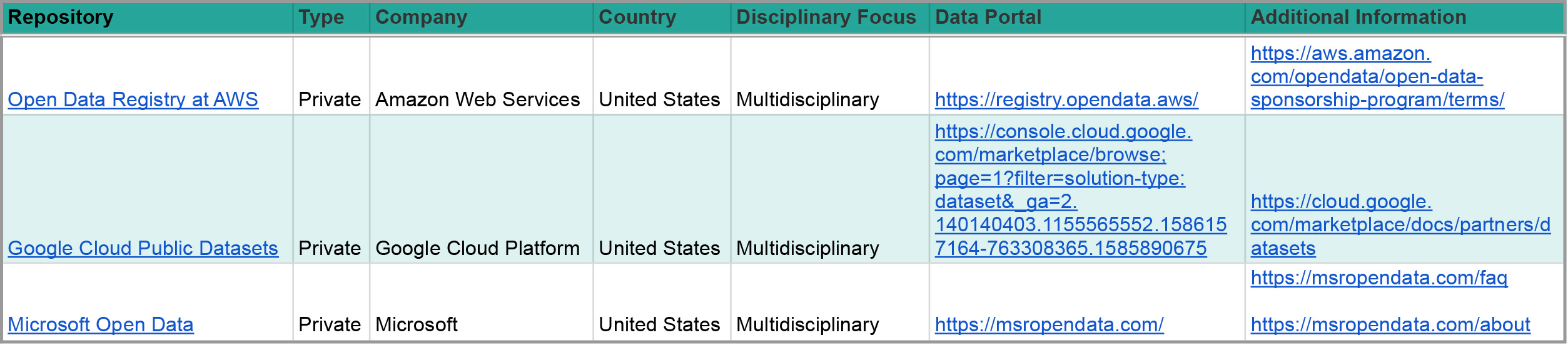 Many private companies have also shown support in the Open Data movement and offer hosting and registry of various datasets. The terms and conditions for these data repositories are not usually publicly accessible, and need to be negotiated with the company who backed them respectively.