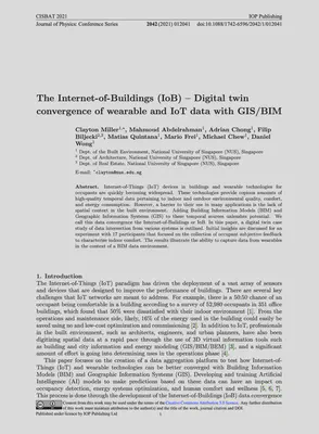 Miller C, Abdelrahman M, Chong A, Biljecki F, Quintana M, Frei M, Chew M, Wong D (2021): The Internet-of-Buildings (IoB) — Digital twin convergence of wearable and IoT data with GIS/BIM. Journal of Physics: Conference Series 2042(1): 012041. 10.1088/1742-6596/2042/1/012041 PDF