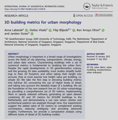 Labetski A, Vitalis S, Biljecki F, Arroyo Ohori K, Stoter J (2023): 3D building metrics for urban morphology. International Journal of Geographical Information Science, 37(1): 36-67. 10.1080/13658816.2022.2103818 PDF