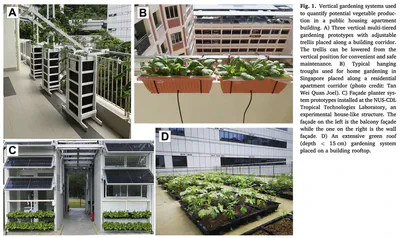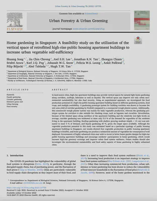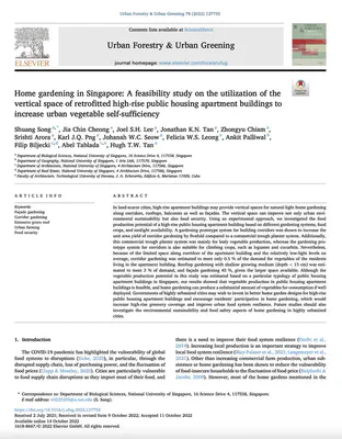 Song S, Cheong JC, Lee JSH, Tan JKN, Chiam Z, Arora S, Png KJQ, Seow JWC, Leong FWS, Palliwal A, Biljecki F, Tablada A, Tan HTW (2022): Home gardening in Singapore: A feasibility study on the utilization of the vertical space of retrofitted high-rise public housing apartment buildings to increase urban vegetable self-sufficiency. Urban Forestry & Urban Greening, 78: 127755. 10.1016/j.ufug.2022.127755 PDF