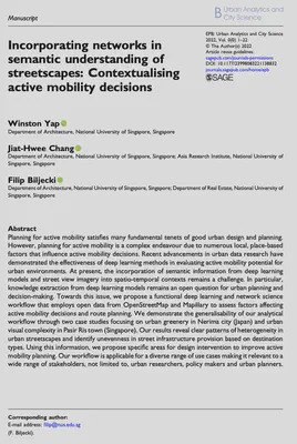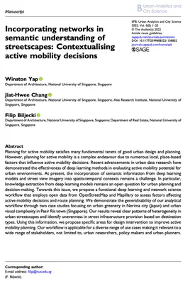 Yap W, Chang JH, Biljecki F (2023): Incorporating Networks in Semantic Understanding of Streetscapes: Contextualising Active Mobility Decisions. Environment and Planning B: Urban Analytics and City Science 50(6): 1416-1437. 10.1177/23998083221138832 PDF