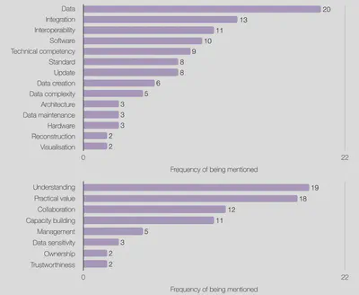 Many challenges to operate digital twins remain, hindering their design and implementation, and are rarely discussed. Furthermore, issues of social and legal nature are often overlooked. We identify the challenges of operating digital twins in the urban context through a bifurcated and multi-dimensional approach: a systematic literature review and an expert survey. The review organises the identified challenges across technical and non-technical dimensions. As the topic is novel, the corpus is rather small and lacking the contextualisation of challenges. Thus, we complement it with a survey based on the Delphi method, involving a diverse panel of domain experts covering academia, industry and government organisations. Combining the results, we identify 14 technical and 9 non-technical challenges and map them to phases of the digital twin’s life cycle. The most severe challenges appear to be related to interoperability (e.g. disparate semantic standards) and practical value (e.g. lack of business models).