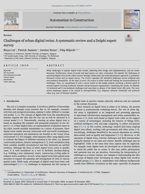 Lei B, Janssen P, Stoter J, Biljecki F (2023): Challenges of Urban Digital Twins: A Systematic Review and a Delphi Expert Survey. Automation in Construction 147: 104716. 10.1016/j.autcon.2022.104716 PDF