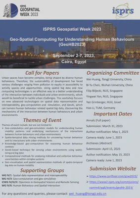 The working group has already a couple of activities, most prominently, the co-organisation of the workshop GeoHB 2023: Geo-Spatial Computing for Understanding Human Behaviours. This event is organised in collaboration with Hao Li (TU Munich), Yingwei Yan (NUS Geography), Wei Huang (Tongji University) (who was at our group last week), Yair Grinberger (HUJ), and Bi Yu Chen (Wuhan University), who are all part of other working groups within the same Commission. The workshop is part of the ISPRS Geospatial Week 2023 in Cairo, Egypt (September 2023).