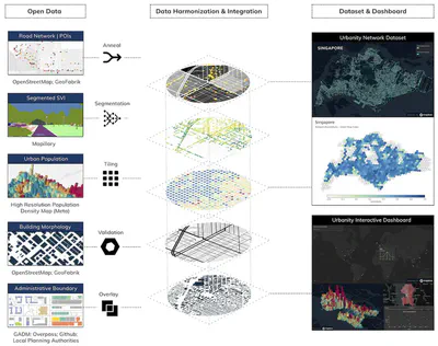 Urbanity is a network-based Python package developed by Winston Yap at our NUS Urban Analytics Lab to automate the construction of feature rich (contextual and semantic) urban networks at any geographical scale. Through an accessible and simple to use interface, users can request heterogeneous urban information such as street view imagery, building morphology, population (including sub-group), and points of interest for target areas of interest.