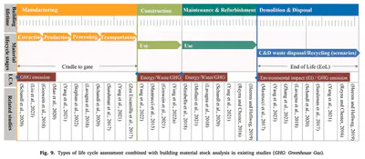 The urban building stock has a high demand for materials and energy, exerting tremendous pressure on natural resources. A current research trend is to integrate Building Material Stock (BMS) analysis with Life Cycle Assessment (LCA) to evaluate energy use, material stock/flows, and related environmental performance associated with the life cycle of building stocks. Compared with urban building energy modelling (UBEM), material-related analysis is a relatively new topic. Some studies applied new techniques and tools to improve the modelling and the dynamic evolution of the BMS system. However, there is a lack of comprehensive review studies summarising the recent publications on these applications. Therefore, this study conducts a comprehensive literature review, primarily focusing on examining the tools and techniques employed for integrating “BMS-LCA” at the urban scale. This review includes 99 articles chosen from a pool of 557 related papers (in the recent decade), systematically retrieved from Scopus and Web of Science, along with additional manual searches. Through a comprehensive bibliometric and content-based synthesis analysis of selected literature, this paper synthesises the techniques/tools used for effectively completing various analysis phases of “BMS-LCA”, including data collection and processing, stock modelling and analysis, and result evaluations. Key findings highlight the significance of integrating artificial intelligence and geospatial technology in optimising data collection, machine learning and data-driven models in enhancing building stock aggregation and classification, and innovative application of relevant LCA software and databases in facilitating BMS’s LCA, etc. This review provides a valuable reference for researchers in future investigations, as it identifies novel ways of applying techniques/tools and opportunities for methodology improvement in the urban-level “BMS-LCA” study.