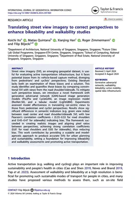Ito K, Quintana M, Han X, Zimmermann R, Biljecki F (2024): Translating street view imagery to correct perspectives to enhance bikeability and walkability studies. International Journal of Geographical Information Science, 38(12): 2514-2544. 10.1080/13658816.2024.2391969 PDF