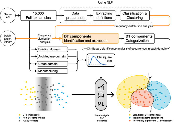 The concept of Digital Twins (DT) has attracted significant attention across various domains, particularly within the built environment. However, there is a sheer volume of definitions and the terminological consensus remains out of reach. The lack of a universally accepted definition leads to ambiguities in their conceptualization and implementation, and may cause miscommunication for both researchers and practitioners. We employed Natural Language Processing (NLP) techniques to systematically extract and analyze definitions of DTs from a corpus of more than 15,000 full-text articles spanning diverse disciplines. The study compares these findings with insights from an expert survey that included 52 experts. The study identifies concurrence on the components that comprise a “Digital Twin” from a practical perspective across various domains, contrasting them with those that do not, to identify deviations. We investigate the evolution of digital twin definitions over time and across different scales, including manufacturing, building, and urban/geospatial perspectives. We extracted the main components of Digital Twins using Text Frequency Analysis and N-gram analysis. Subsequently, we identified components that appeared in the literature and conducted a Chi-square test to assess the significance of each component in different domains. Our analysis identified key components of digital twins and revealed significant variations in definitions based on application domains, such as manufacturing, building, and urban contexts. The analysis of DT components reveal two major groups of DT types: High-Performance Real-Time (HPRT) DTs, and Long-Term Decision Support (LTDS) DTs. Contrary to common assumptions, we found that components such as simulation, AI/ML, real-time capabilities, and bi-directional data flow are not yet fully mature in the digital twins of the built environment. We derived two definitions for the Building/Architecture DT and the City/Urban DTs. Both definitions have a must-have components (such as spatial and temporal data updates) and good-to-have components such as prediction, AI, bi-directional data flow, and Real-time data exchange. One of the key findings is that the definition of digital twins has not yet reached its equilibrium phase, highlighting the need for ongoing revisions as technologies emerge or existing ones become obsolete. To address this, we introduce a novel, reproducible methodology that enables researchers to refine and adapt the current definitions in response to technological advancements or deprecations.