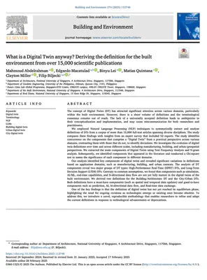 Abdelrahman M, Macatulad E, Lei B, Quintana M, Miller C, Biljecki F (2025): What is a Digital Twin anyway? Deriving the definition for the built environment from over 15,000 scientific publications. Building and Environment, 274: 112748. 10.1016/j.buildenv.2025.112748 PDF