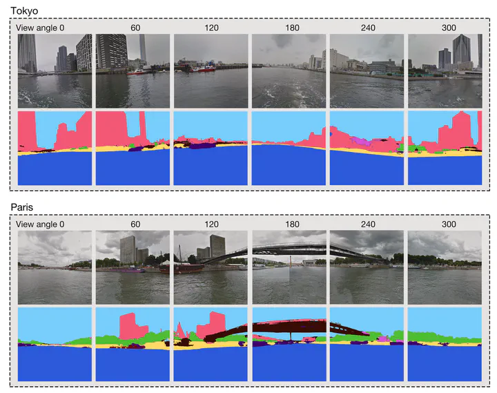 Gathering knowledge about physical settings and visual information of places has long been of interest to a wide variety of fields as they affect the experience of observers. Previous studies have relied on on-site surveys, low-throughput methods, and limited data sources, which especially hinder analyzing waterscape features. Thus, detecting the relationships between the human perception results of large-scale urban water areas and the waterfront features at high spatial resolutions remains challenging, and worldwide studies have not been conducted. We investigate an alternative: a data-driven waterscapes evaluation approach based on computer vision (CV) to analyze water view imagery (WVI) in 16 cities around the world and measure how people perceive scenes using virtual reality (VR). We bring attention to WVI – the counterpart of street view imagery (SVI) on water bodies, which is readily available for many cities thanks to the usual SVI services, but has been entirely overlooked in research hitherto. Specifically, a deep learning model, which has been trained with 500 segmented water-level photos, was developed to analyze them, achieving the mean pixel accuracy (MPA) of 94%, which advances state of the art. These panoramic images have been assessed through a virtual experience survey in which 60 participants indicated their perceptions across multiple dimensions. Afterwards, a series of statistical analyses were conducted to determine the visual indicators that drive perceptions, and the relationship between the people’s subjective visual perceptions and objective waterscape environment as seen by machines has been established. The results take researchers and watercourse planners one step toward understanding the interactions of the perceptions and semantics of water areas globally. The large-scale dataset we produced in this research has been released openly as the first such instance of open segmented water view imagery, and it is intended to support future studies.