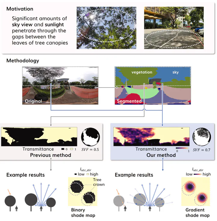 Street-view-based techniques for assessing the sky view factor (SVF) and solar irradiance under trees are gaining attention as tools for evaluating trees as nature-based solutions to mitigate urban heat risks. Although these metrics significantly depend on the morphology of trees and resulting canopy transmittance, an existing approach, termed the Solid Canopy Method (SCM), assumes zero transmission and has not accounted for these variations. This paper advances the computation of both metrics, improving their accuracy and application — we developed the Transmissive Canopy Method (TCM), a panorama-based approach that integrates semantic segmentation and binarization to evaluate SVF and solar irradiance while accounting for transmittance of tree canopies. Using a study area on a university campus in Singapore, we collected data on solar irradiance and 360°imagery to validate our method. The results indicated improved accuracy with MAE, RMSE, and R values of 77.8 Wm−2, 105.0 Wm−2 and 0.90, respectively — significantly outperforming the SCM. We showcased two use cases of our method: (1) high-resolution mapping of SVF and solar irradiance in a field with trees, and (2) walking route optimization considering sunlight exposure. Our findings highlight the strong capability of our TCM to evaluate the effects of trees in mitigating urban heat more accurately than the existing method. Additionally, the TCM has potential applications in urban planning and management, enabling strategic tree planting prioritizing areas lacking sufficient shading and developing tools for optimizing walking routes to minimize sunlight exposure.