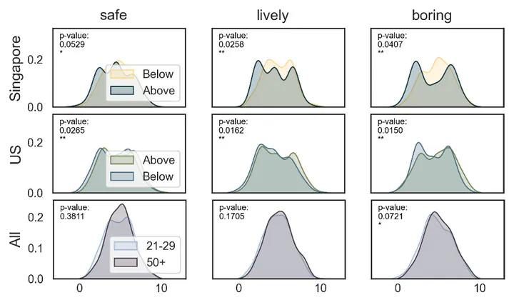 Understanding peoples preferences and needs is crucial for decision making in urban planning. However, studies have yet to analyze and quantify the influence of demographic factors and perception differences between countries. In this work, we explore the introduction of demographic questions, specifically age groups and the Big Five personality traits, in visual urban perception field experiments to assess the difference perception score in six dimensions - safe, lively, boring, depressing, wealthy, and beautiful - within demographic subgroups and between two countries. We found significant (p-value < 0.05) differences in perception scores in all six dimensions at the country level (conscientious and neurotic groups in Singapore and the US) and at the population level (age groups over both countries). This preliminary results set the stage to bigger and broader experiments.