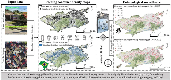 Identification of Aedes aegypti breeding hotspots is essential for the implementation of targeted vector control strategies and thus the prevention of several mosquito-borne diseases worldwide. Training computer vision models on satellite and street view imagery in the municipality of Rio de Janeiro, we analyzed the correlation between the density of common breeding grounds and Aedes aegypti infestation measured by ovitraps on a monthly basis between 2019 and 2022. Our findings emphasized the significance (p ≤ 0.05) of micro-habitat proxies generated through object detection, allowing to explain high spatial variance in urban abundance of Aedes aegypti immatures. Water tanks, non-mounted car tires, plastic bags, potted plants, and storm drains positively correlated with Aedes aegypti egg and larva counts considering a 1000 m mosquito flight range buffer around 2700 ovitrap locations, while dumpsters, small trash bins, and large trash bins exhibited a negative association. This complementary application of satellite and street view imagery opens the pathway for high-resolution interpolation of entomological surveillance data and has the potential to optimize vector control strategies. Consequently it supports the mitigation of emerging infectious diseases transmitted by Aedes aegypti, such as dengue, chikungunya, and Zika, which cause thousands of deaths each year.