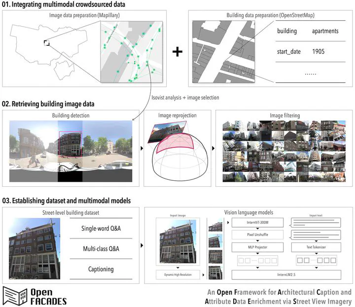 Building properties, such as height, usage, and material, play a crucial role in spatial data infrastructures, supporting various urban applications. Despite their importance, comprehensive building attribute data remain scarce in many urban areas. Recent advances have enabled the extraction of objective building attributes using remote sensing and street-level imagery. However, establishing a pipeline that integrates diverse open datasets, acquires holistic building imagery, and infers comprehensive building attributes at scale remains a significant challenge. Among the first, this study bridges the gaps by introducing OpenFACADES, an open framework that leverages multimodal crowdsourced data to enrich building profiles with both objective attributes and semantic descriptors through multimodal large language models. First, we integrate street-level image metadata from Mapillary with OpenStreetMap geometries via isovist analysis, identifying images that provide suitable vantage points for observing target buildings. Second, we automate the detection of building facades in panoramic imagery and tailor a reprojection approach to convert objects into holistic perspective views that approximate real-world observation. Third, we introduce an innovative approach that harnesses and investigates the capabilities of open-source large vision-language models (VLMs) for multi-attribute prediction and open-vocabulary captioning in building-level analytics, leveraging a globally sourced dataset of 31,180 labeled images from seven cities. Evaluation shows that fine-tuned VLM excel in multi-attribute inference, outperforming single-attribute computer vision models and zero-shot ChatGPT-4o. Further experiments confirm its superior generalization and robustness across culturally distinct region and varying image conditions. Finally, the model is applied for large-scale building annotation, generating a dataset of 1.2 million images for half a million buildings. This open‐source framework enhances the scope, adaptability, and granularity of building‐level assessments, enabling more fine‐grained and interpretable insights into the built environment. Our dataset and code are available openly at: https://github.com/seshing/OpenFACADES.