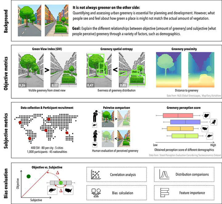 Quantifying and assessing urban greenery is consequential for planning and development, reflecting the everlasting importance of green spaces for multiple climate and well-being dimensions of cities. Evaluation can be broadly grouped into objective (e.g., measuring the amount of greenery) and subjective (e.g., polling the perception of people) approaches, which may differ – what people see and feel about how green a place is might not match the measurements of the actual amount of vegetation. In this work, we advance the state of the art by measuring such differences and explaining them through human, geographic, and spatial dimensions. The experiments rely on contextual information extracted from street view imagery and a comprehensive urban visual perception survey collected from 1000 people across five countries with their extensive demographic and personality information. We analyze the discrepancies between objective measures (e.g., Green View Index (GVI)) and subjective scores (e.g., pairwise ratings), examining whether they can be explained by a variety of human and visual factors such as age group and spatial variation of greenery in the scene. The findings reveal that such discrepancies are comparable around the world and that demographics and personality do not play a significant role in perception. Further, while perceived and measured greenery correlate consistently across geographies (both where people and where imagery are from), where people live plays a significant role in explaining perceptual differences, with these two, as the top among seven, features that influences perceived greenery the most. This location influence suggests that cultural, environmental, and experiential factors substantially shape how individuals observe greenery in cities. We also found that the spatial arrangement of greenery in the sight, rather than its proximity to the person, influences perception. Our study provides a new understanding of the deep relationships between objective and subjective street-level greenery assessments, contributing to a more human-centric design of green urban environments.