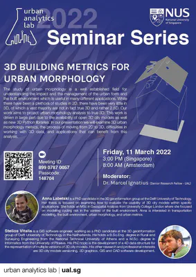 The study of urban morphology is a well established field for understanding the impact and the management of the urban form and the built environment which is useful in many different applications. While there have been a plethora of studies in 2D, there have been very little in 3D, of which a vast majority are not in fact true 3D and rather 2.5D. Our work aims to project urban morphology analysis to true 3D. This work is driven in large part due to the availability of open 3D city models as well as new 3D Python libraries. In our presentation we will examine 3D urban morphology metrics, the process of moving from 2D to 3D, difficulties in working with 3D data, and applications that can benefit from this analvsis.
