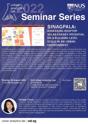 The Philippines has committed to transitioning into a low-carbon future by reducing coal-fired generation and increasing the share of renewable energy sources such as solar power. However, there is a lack of solar energy potential estimators in the Philippine context which makes it difficult to assess the feasibility of using solar photovoltaics in a given area. Urban environments pose a strong potential in significantly reducing overall reliance on fossil fuel energy as their density takes up a big portion of the energy consumption. Various studies have assessed the solar energy potential and were able to acquire substantial results. However, few studies have considered the context where an area has limited to no access to expensive, but reliable, data such as light detecting and ranging (LiDAR). In this talk, we propose using readily available satellite images to be fed into a convolutional neural network (CNN) for rooftop segmentation which will then be used along with meteorological data, through theoretical computations, to estimate the solar energy potential of buildings in an urban environment.
