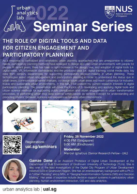 As a response to centralized and rationalistic urban planning approaches that are unresponsive to citizens’ needs, participatory planning methods have emerged to design and plan urban environments with people for people. In recent years, there has been a rapid increase in the design, use, and adoption of digital tools (i.e. digital twins, VR, information dashboards) and the produced data (i.e. digital tracking, social media data, big data from sensory experiences) for supporting participatory decision-making in urban planning. These technologies assist citizen engagement and participatory planning in order to understand the status quo in urban areas, communicate potential changes, co-design future urban areas and reach consensus for inclusive, livable and sustainable urban environments. In this talk, I will present my current research interests in digital participatory planning. The presentation will cover the topics of (i) developing and applying digital tools and citizen science methods for supporting public participation and citizen engagement in urban transformation processes, (ii) performing urban (big) data science within people as sensors concept for understanding and predicting citizens’ behavior, opinions and experiences towards urban interventions.