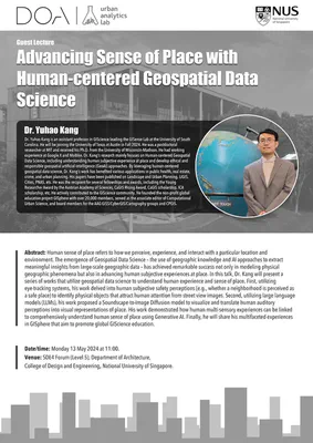 Human sense of place refers to how we perceive, experience, and interact with a particular location and environment. The emergence of Geospatial Data Science – the use of geographic knowledge and AI approaches to extract meaningful insights from large-scale geographic data – has achieved remarkable success not only in modeling physical geographic phenomena but also in advancing human subjective experiences at place. In this talk, Dr. Kang will present a series of works that utilize geospatial data science to understand human experience and sense of place. First, utilizing eye-tracking systems, his work delved into human subjective safety perceptions (e.g., whether a neighborhood is perceived as a safe place) to identify physical objects that attract human attention from street view images. Second, utilizing large language models (LLMs), his work proposed a Soundscape-to-Image Diffusion model to visualize and translate human auditory perceptions into visual representations of place. His work demonstrated how human multi-sensory experiences can be linked to comprehensively understand human sense of place using Generative AI. Finally, he will share his multifaceted experiences in GISphere that aim to promote global GIScience education.
