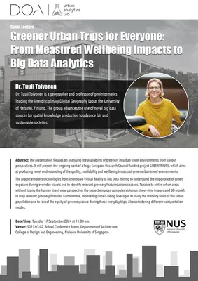 The presentation focuses on analysing the availability of greenery in urban travel environments from various perspectives. It will present the ongoing work of a large European Research Council funded project GREENTRAVEL, which aims at producing novel understanding of the quality, availability and wellbeing impacts of green urban travel environments. The project employs technologies from immersive Virtual Reality to Big Data mining to understand the importance of green exposure during everyday travels and to identify relevant greenery features across seasons. To scale to entire urban areas without losing the human street view perspective, the project employs computer vision on street-view images and 3D models to map relevant greenery features. Furthermore, mobile Big Data is being leveraged to study the mobility flows of the urban population and to reveal the equity of green exposure during these everyday trips, also considering different transportation modes. The presentation will describe the ongoing work of the project and more broadly the urban research at the Digital Geography Lab, hopefully providing a platform for fruitful discussions.